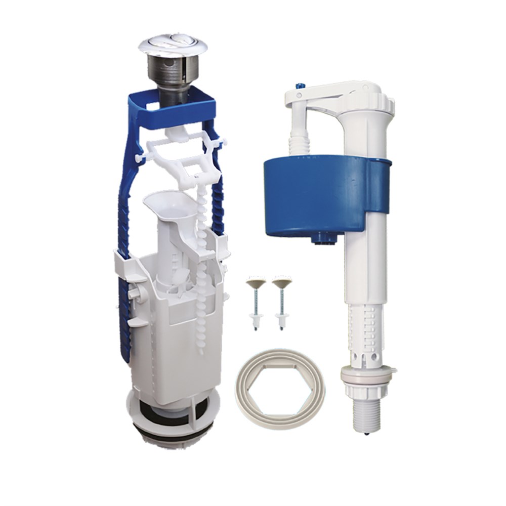 Комплекты арматуры с кнопочным одноуровневым/двухуровневым клапаном выпуска предназначены для использования с керамическими бачками, отверстие в крышке которых имеет примерный диаметр 40 мм. Комплекты с двухуровневым клапаном обеспечивают экономное расходование воды.