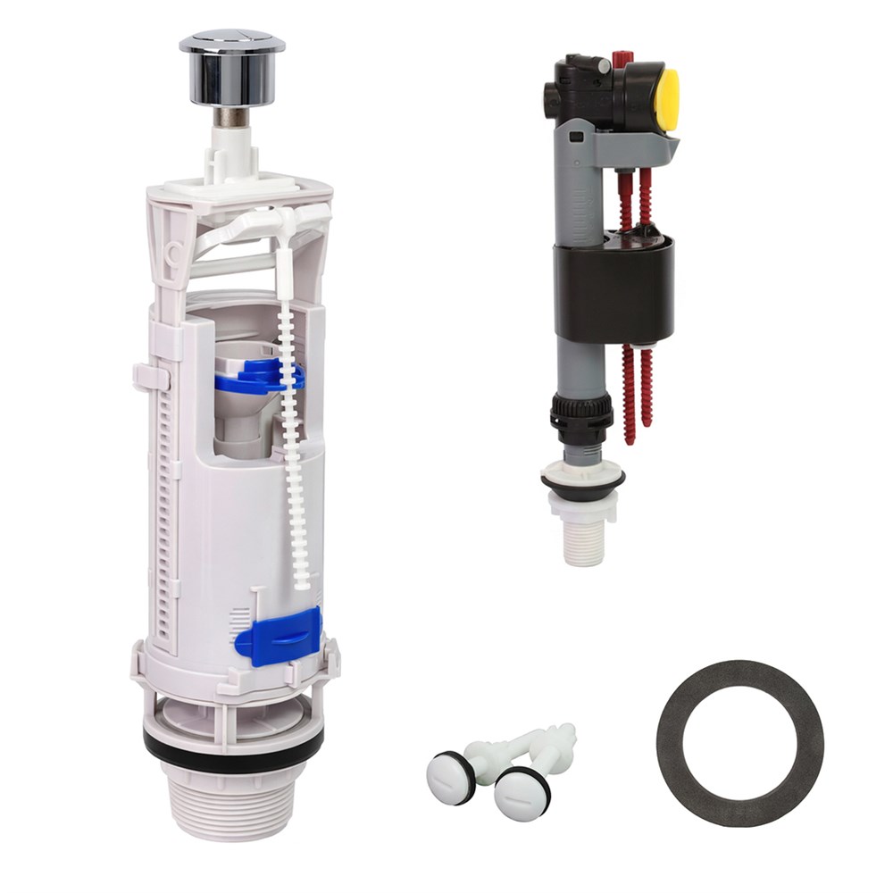 Комплект смывной арматуры предназначен для керамических и пластиковых бачков унитазов. В набор входят все необходимые элементы для монтажа: смывная колонка с хромированной двухкнопочной панелью, универсальный наполнительный клапан (с возможностью бокового или нижнего подключения резьба 1/2"), прокладка между бачком и чашей, крепежные болты, а также фильтрующий элемент для защиты клапана.