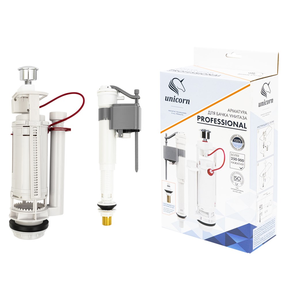 Арматура к смыв. бачку 2-ух Кноп. UNICORN хром, универс. (бок/ниж.подв, лат.штуцер 1/2") KAU_K/L_1/2
