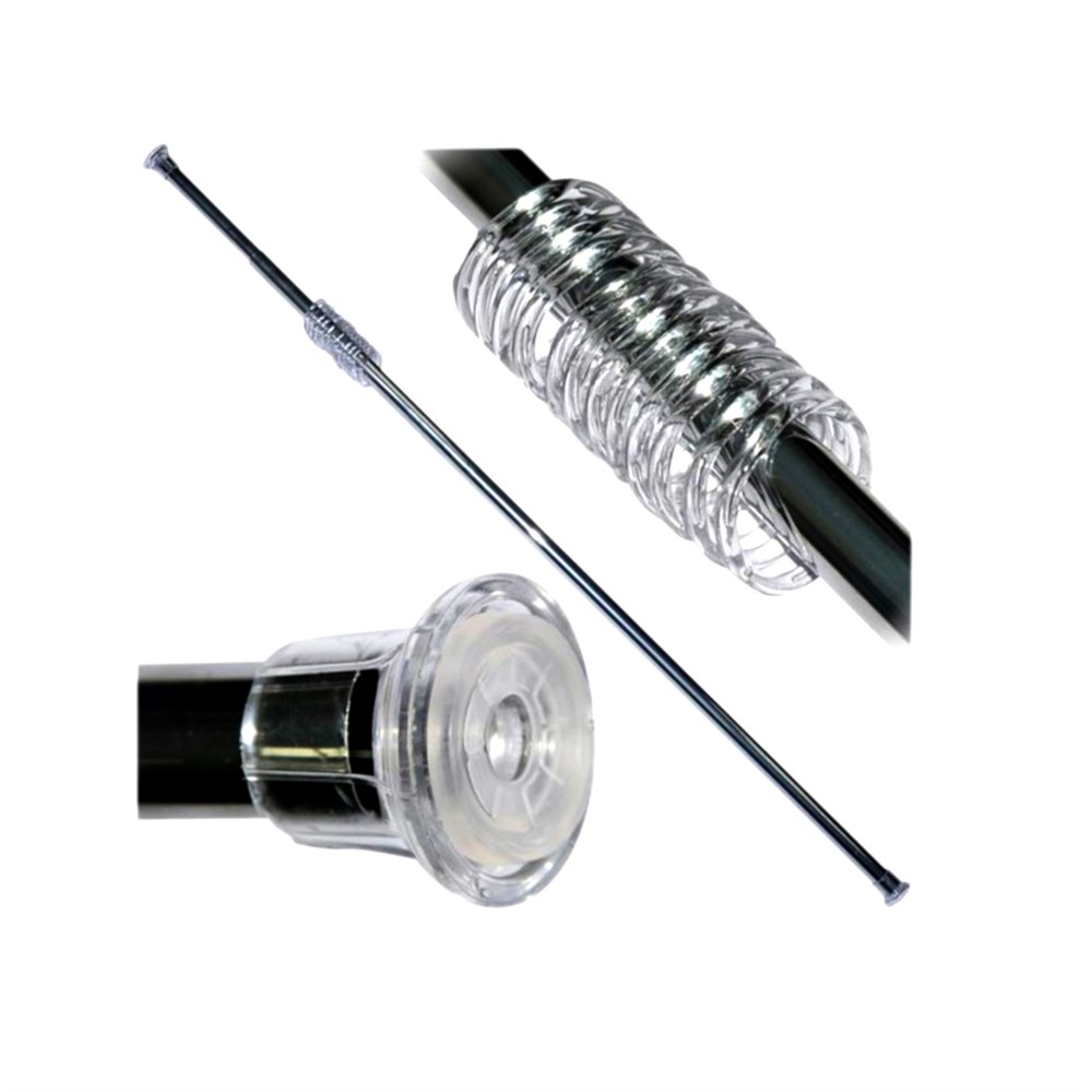 Карниз для шторки в ванную комнату с раздвижным телескопическим механизмом для регулировки длины. Конструкция представляет собой две трубки, вставленные одна в другую. Внутри карниза скрывается специальный механизм с пружиной, отвечающий за фиксацию трубок относительно друг друга в выбранном положении. Силиконовые вставки по краям карниза предотвратят его скольжение по стенам. В комплект поставки входят 12 пластиковых колец для крепления шторки к карнизу.