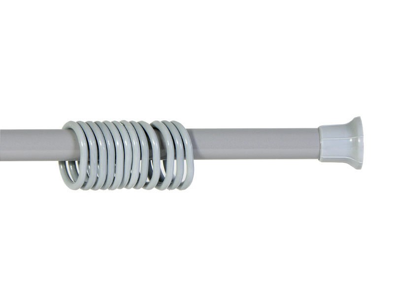 Карниз для шторки в ванную комнату с раздвижным телескопическим механизмом для регулировки длины. Конструкция представляет собой две трубки, вставленные одна в другую. Внутри карниза скрывается специальный механизм с пружиной, отвечающий за фиксацию трубок относительно друг друга в выбранном положении. Силиконовые вставки по краям карниза предотвратят его скольжение по стенам. В комплект поставки входят 12 пластиковых колец для крепления шторки к карнизу.