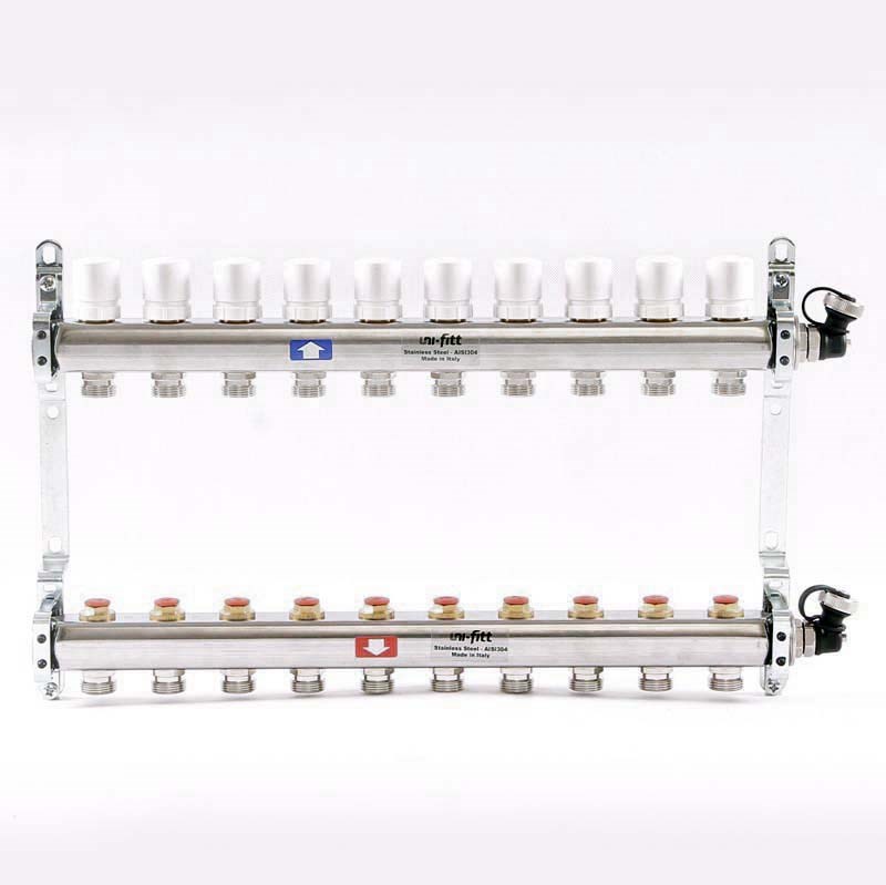 Колл.группа 1" х 10 вых 3/4" с балансировочными и термостатическими вентилями, нерж. сталь
