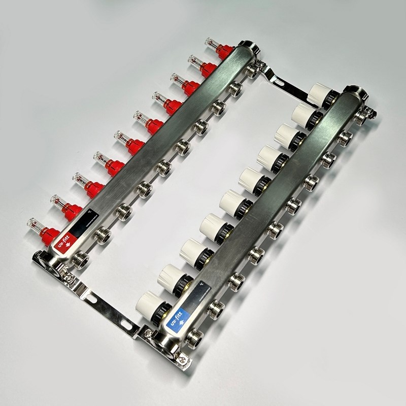 Колл.группа 1" х 10 вых 3/4" с расходомерами и термостатическими вентилями без конц, нерж. сталь
