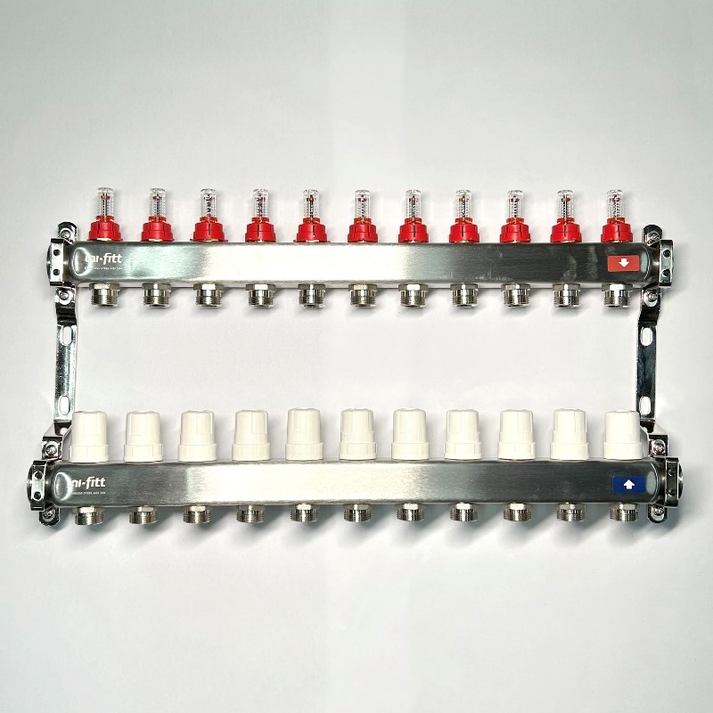 Колл.группа 1" х 11 вых 3/4" с расходомерами и термостатическими вентилями без конц, нерж. сталь