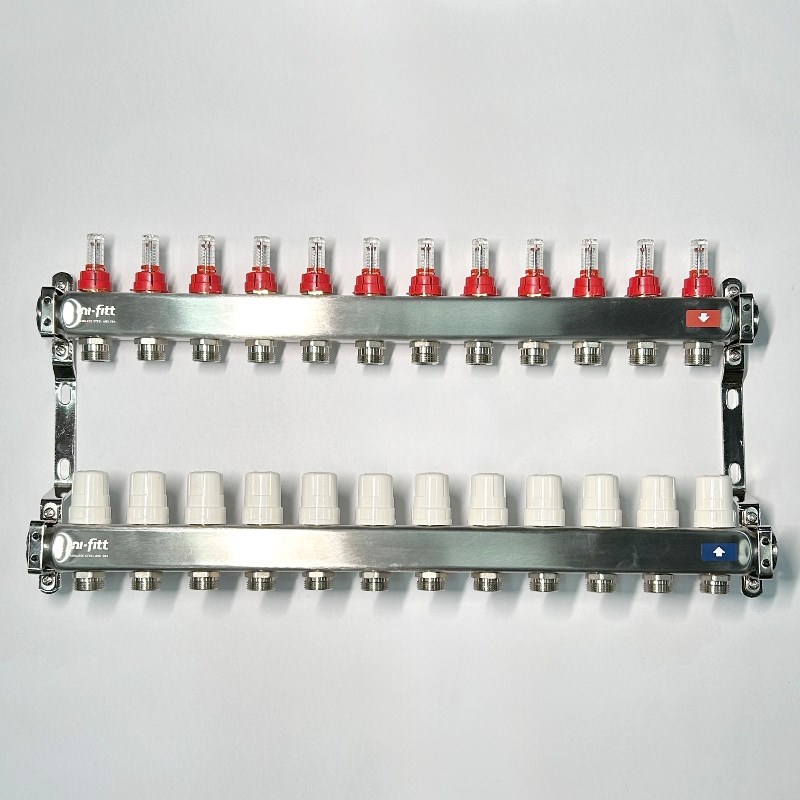 Колл.группа 1" х 12 вых 3/4" с расходомерами и термостатическими вентилями без конц, нерж. сталь
