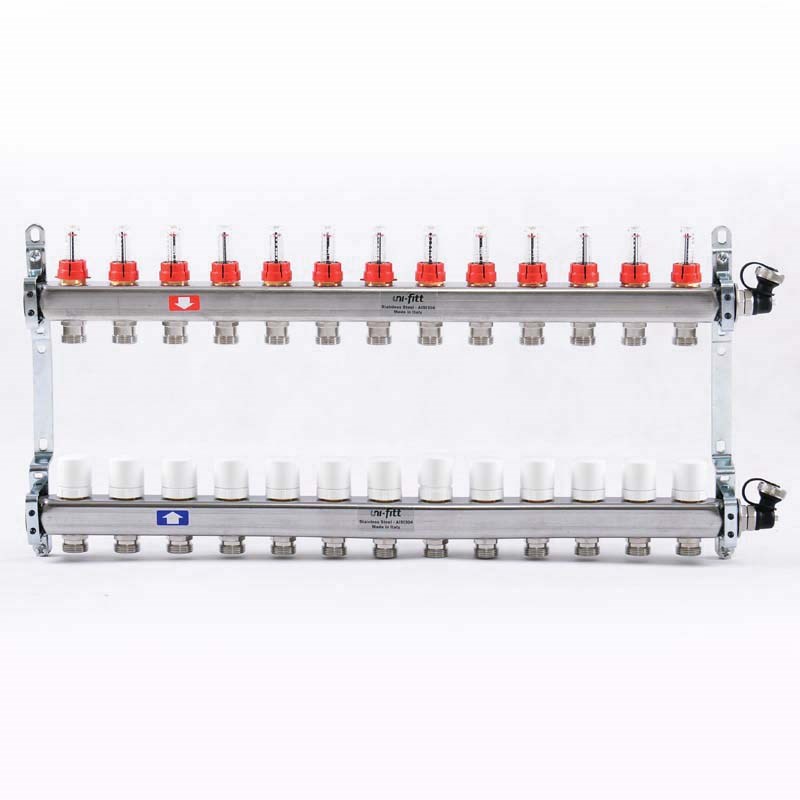 Колл.группа 1" х 13 вых 3/4" с расходомерами и термостатическими вентилями, нерж. сталь
