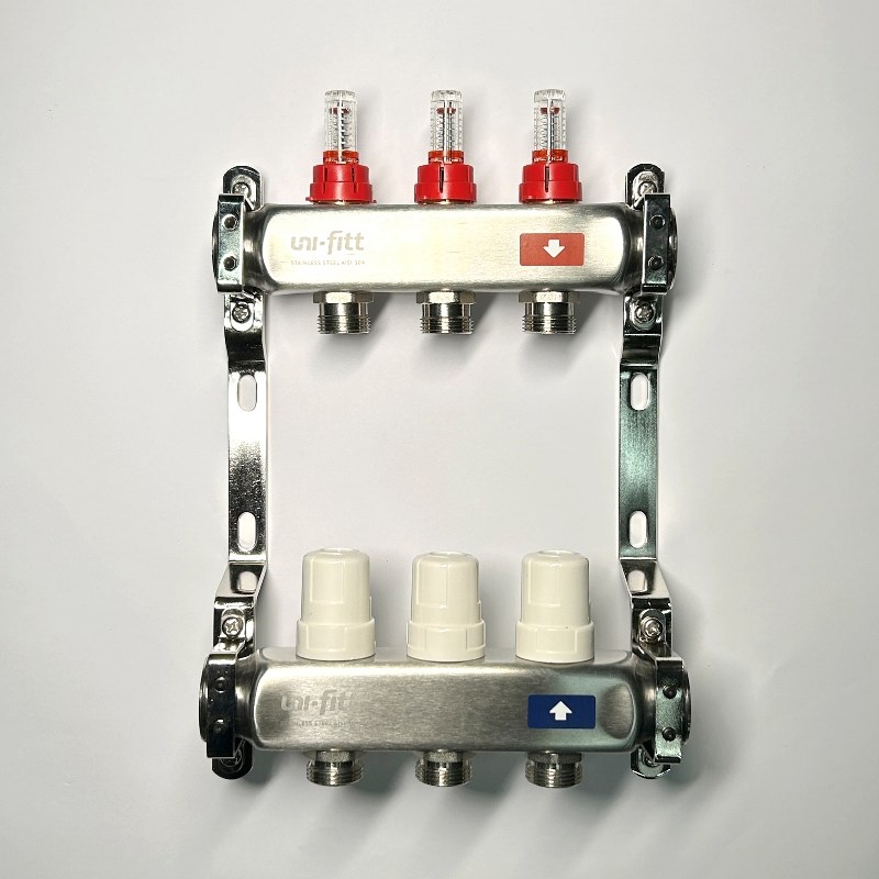 Колл.группа 1" х 3 вых 3/4" с расходомерами и термостатическими вентилями без конц, нерж. сталь
