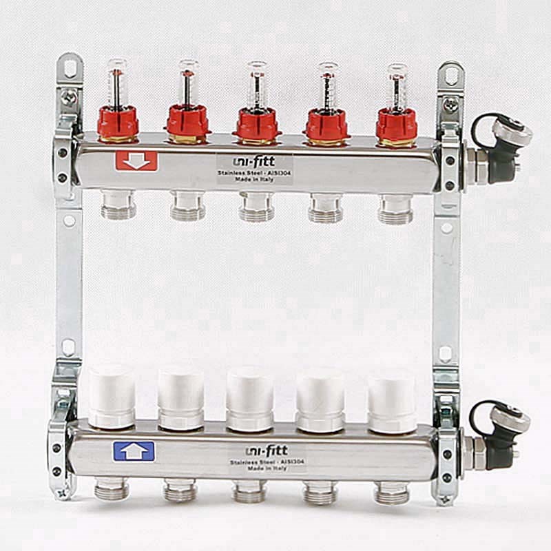 Колл.группа 1" х 5 вых 3/4" с расходомерами и термостатическими вентилями, нерж. сталь