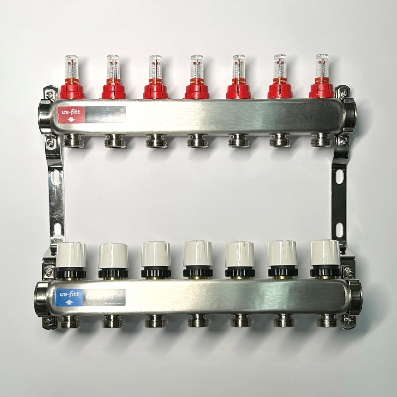 Колл.группа 1" х 7 вых 3/4" с расходомерами и термостатическими вентилями без конц, нерж. сталь