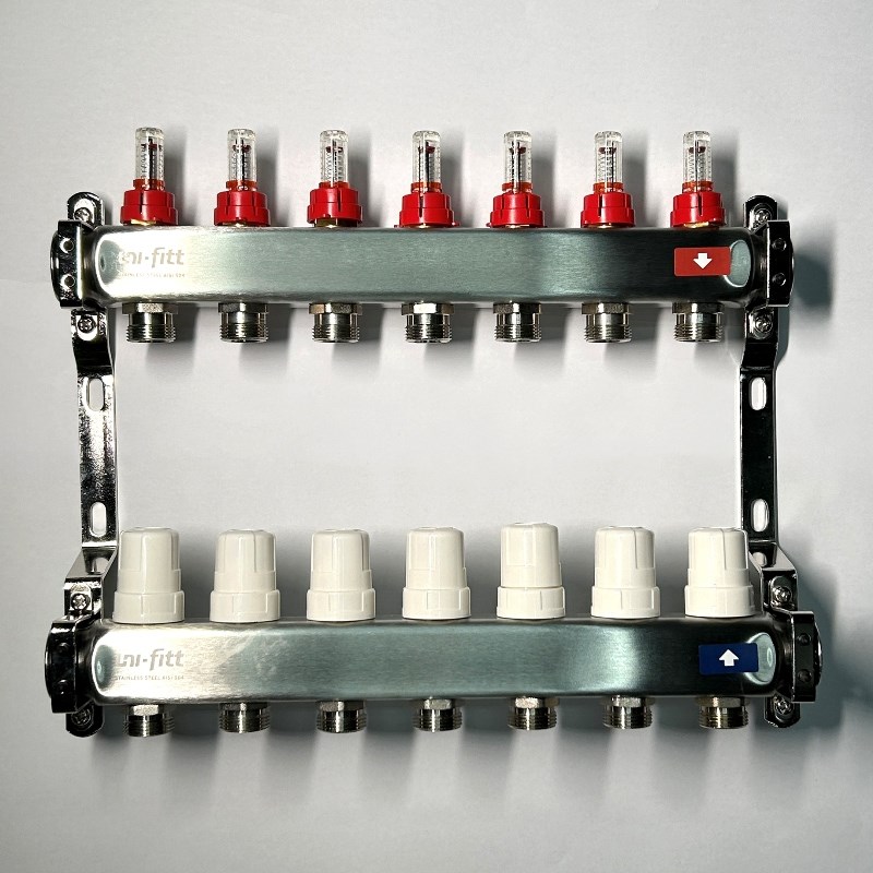 Колл.группа 1" х 7 вых 3/4" с расходомерами и термостатическими вентилями без конц, нерж. сталь