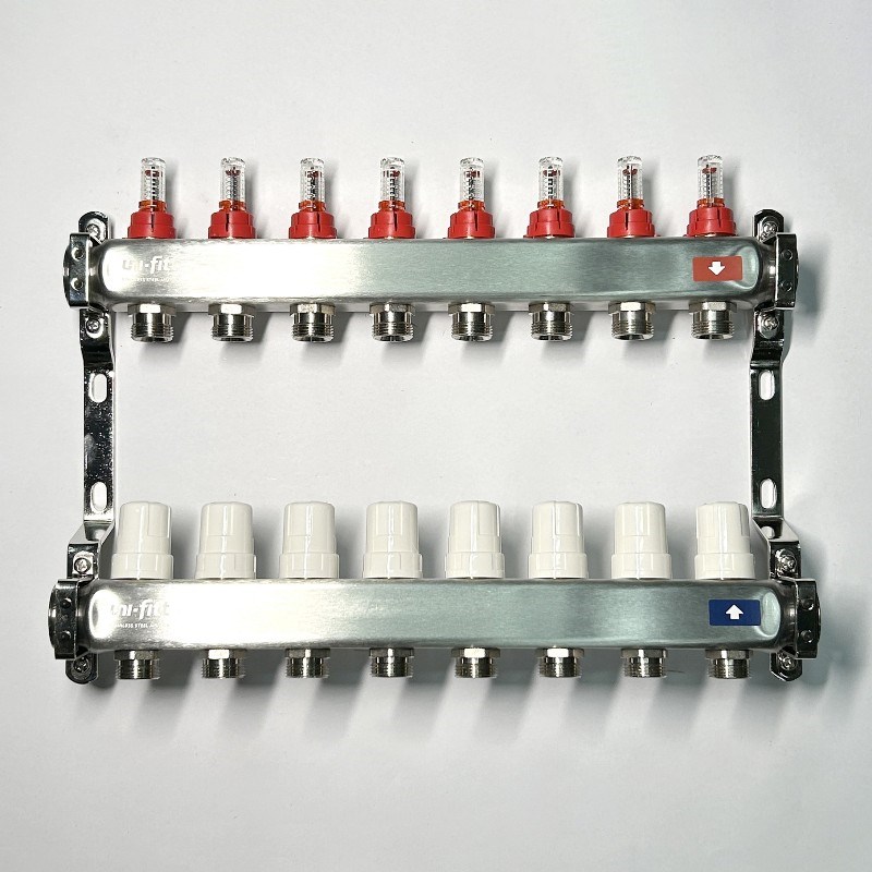 Колл.группа 1" х 8 вых 3/4" с расходомерами и термостатическими вентилями без конц, нерж. сталь