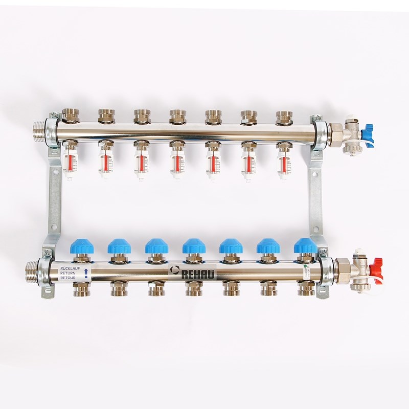 Колл.группа 1" х 8 вых 3/4" с расходомерами и термостатическими вентилями, нерж. сталь