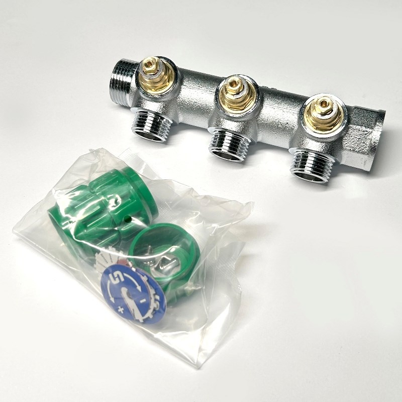 Коллектор НВ 3/4" х 3 вых 1/2" универсальный, вых 90', 45 мм, с вентилями, хром