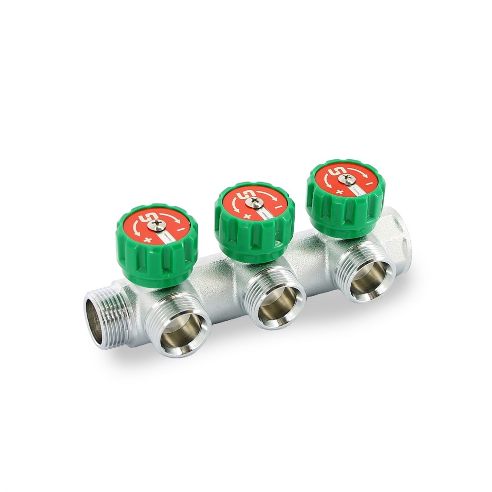 Коллектор НВ 3/4" х 3 вых 3/4" ЕК, с вентилями, никель