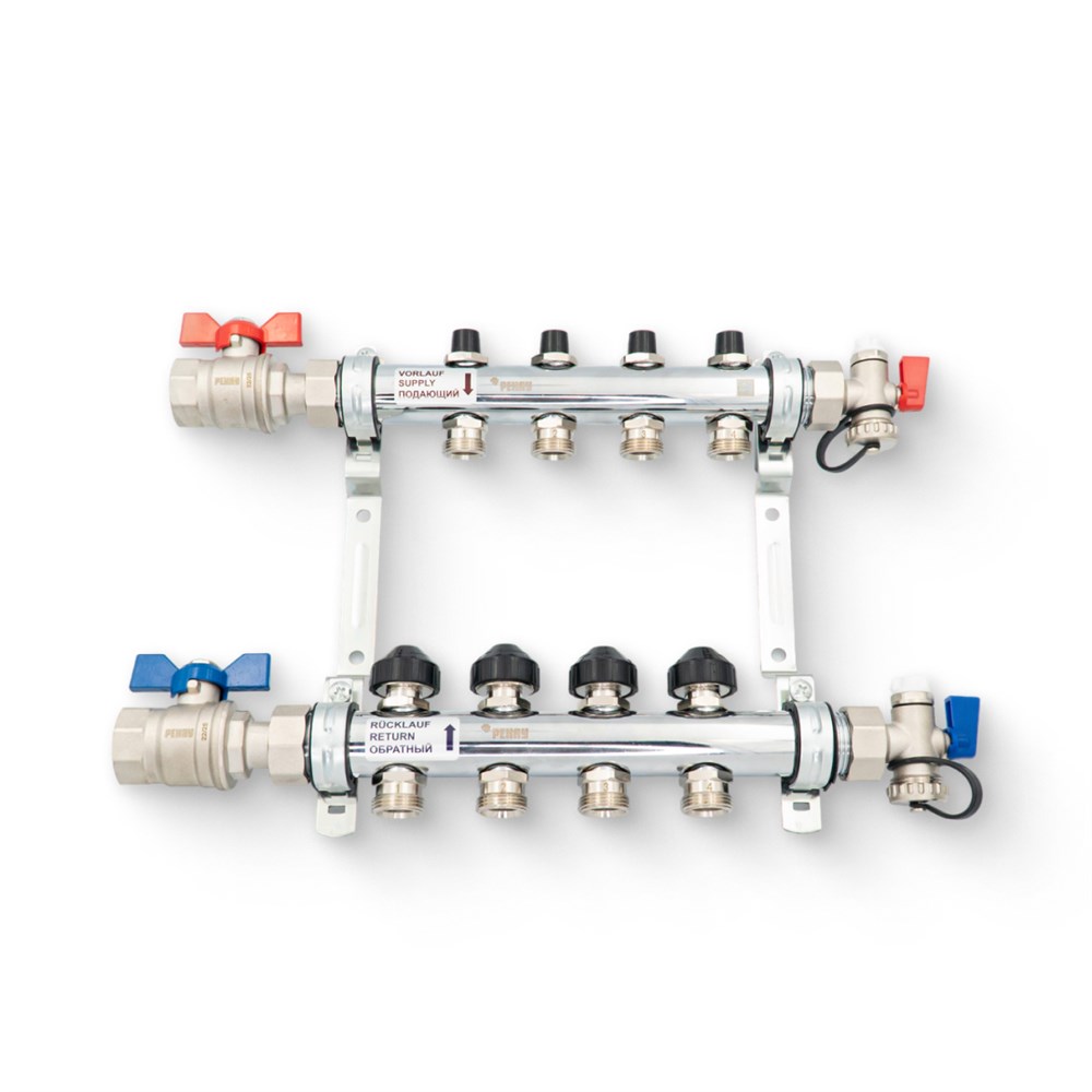 Коллекторная группа с шар. кранами HKV 1" х 7 вых. 3/4"ЕК, с баланс-ными и терм. вент, нерж.сталь