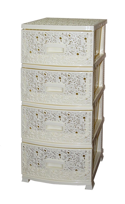 Комод из пищевого пластика с четырьмя выдвижными ящиками предназначен для хранения вещей и продуктов питания. Он гармонично впишется в интерьер любой комнаты. Легкий и вместительный комод поможет обеспечить порядок в доме. Узор на передних панелях придаст индивидуальность и подарит настроение.