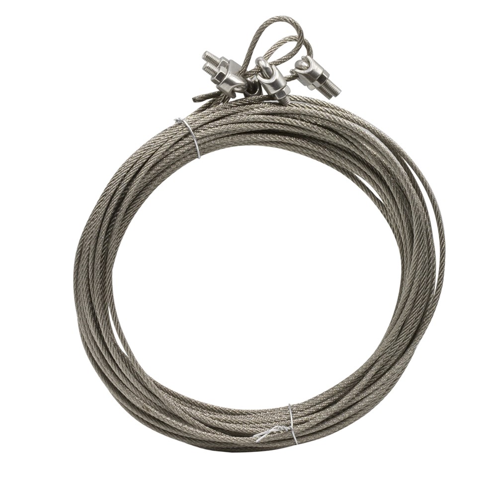 Материал изготовления - нержавеющая сталь AISI 304 диаметром 3мм. Материал и диаметр троса подобраны оптимально, чтобы добиться надёжной фиксации насоса в скважине и не волноваться о его коррозии в следствии высокой влажности. Фиксировать трос на насосе и на оголовке необходимо с использование пары креплений.