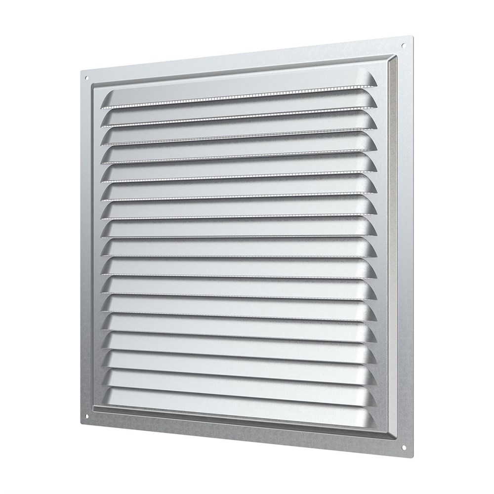 Вентиляционная решетка изготавливается из оцинкованной стали. Имеет наклонные жалюзи и антимоскитную сетку для защиты от насекомых. Сетка устанавливается в специальном углублении.