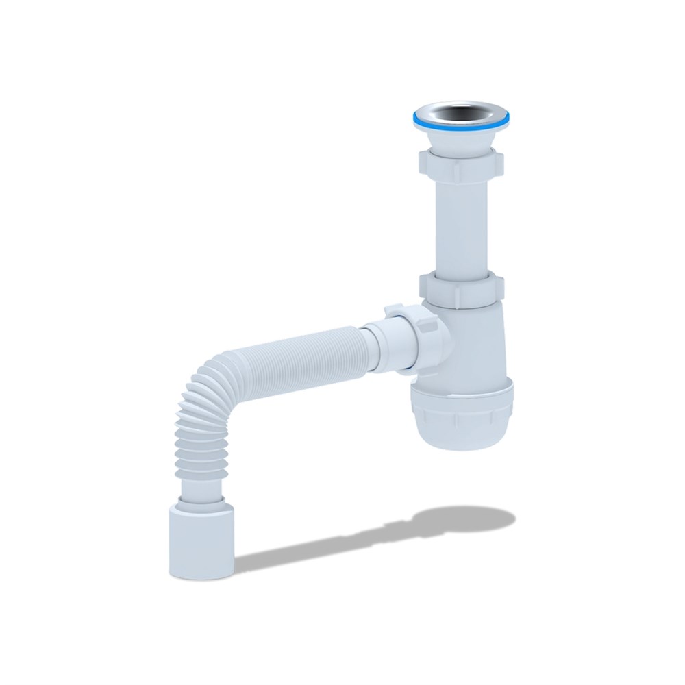 Сифон для кухонных моек с диаметром сливного отверстия 50мм, бутылочного типа с увеличенным корпусом, с разборным выпуском и нержавеющей решеткой. Для подключения к канализации комлектуется гибкой трубой 40*50мм.