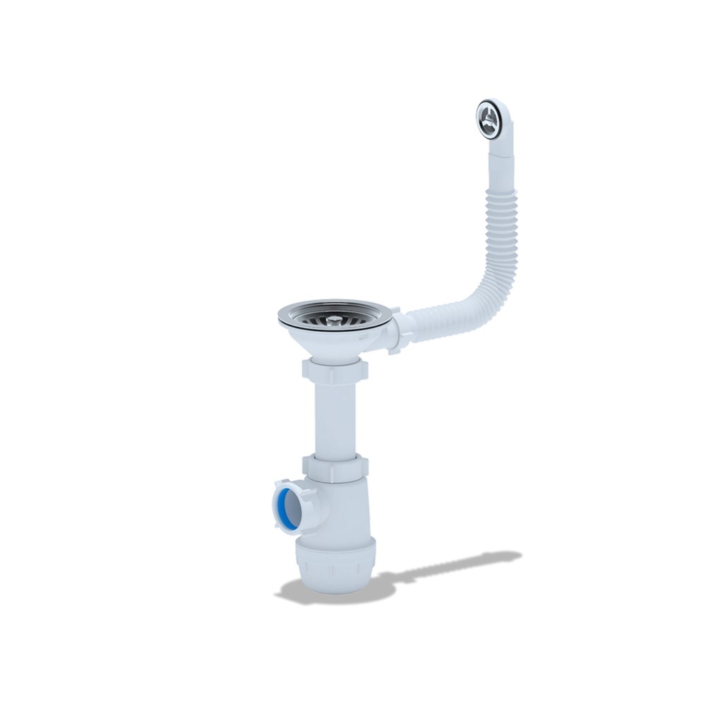 Сифон для кухонных моек с диаметром сливного отверстия 90мм, бутылочного типа с увеличенным корпусом, с разборным выпуском и нержавеющей решеткой, с гибким прямоугольным переливом для моек из нержавеющей стали. Корпус перелива оборудован универсальной прокладкой для круглых и прямоугольных моек, нужная сторона прокладки достигается путем переворота. Выход для подключения к канализации 40мм.