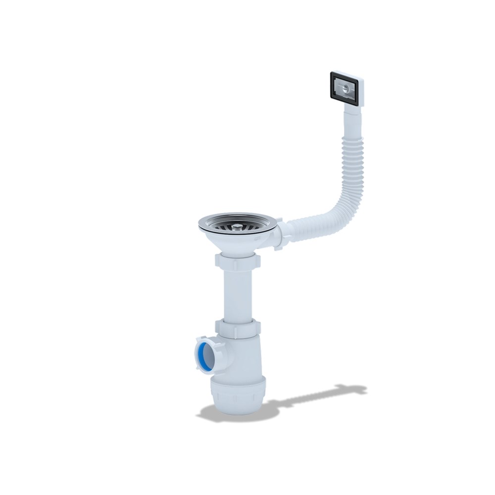 Сифон сливной АНИ пласт A0145S для кухонных моек с диаметром сливного отверстия 90-98 мм, бутылочного типа с увеличенным корпусом, с разборным выпуском и нержавеющей решеткой, с гибким прямоугольным переливом. Корпус перелива оборудован универсальной прокладкой для круглых и прямоугольных моек, нужная сторона прокладки достигается путем переворота. Выход для подключения к канализации 40мм. Высота 105 - 185 мм.