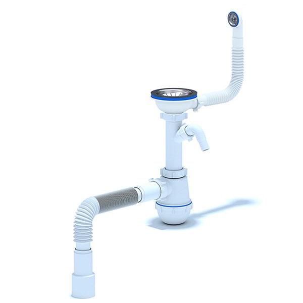 Сифон для кухонных моек с диаметром сливного отверстия 90мм, бутылочного типа с увеличенным корпусом, с разборным выпуском и нержавеющей решеткой, с гибким круглым переливом для моек из нержавеющей стали, с носиком для подключения стиральной и посудомоечной машины.