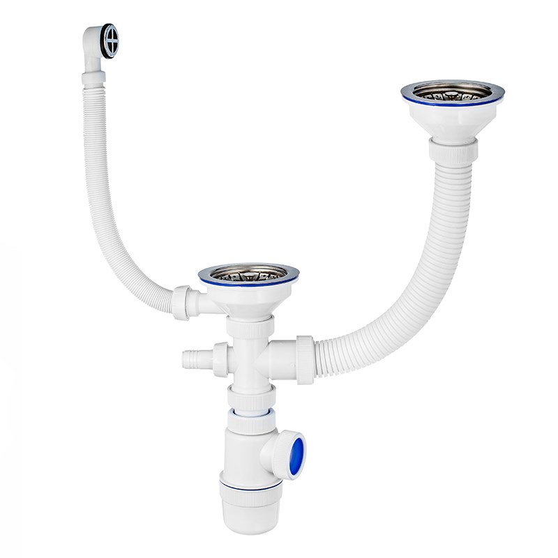 Сифон Элит 1 1/2 х 40 мм для двойной мойки с нерж. чашками D114 мм, с отводом и с круг.пер. L300 мм
