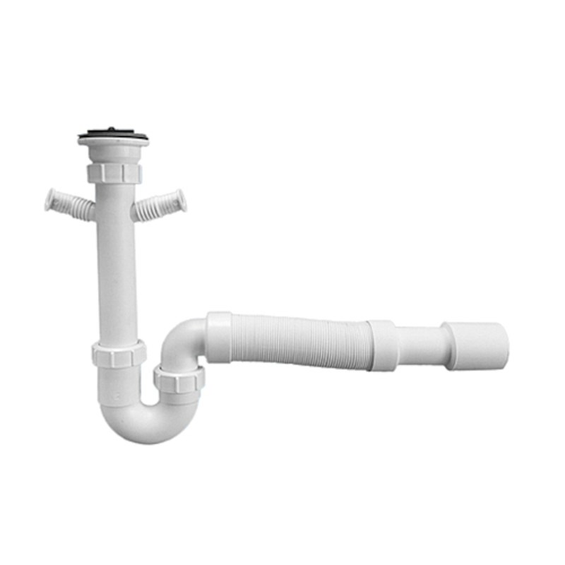 Сифон трубный S-образный 1 1/2" х 40 мм с вып. 70 мм нерж., пробка, 2 адапт. для слива быт.тех.