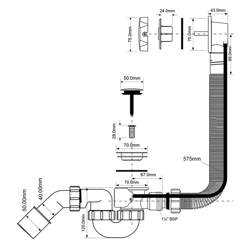 Слив-перелив L=575 х 34 мм, нерж.70 мм слив., пробкой, выход 40/50 мм, хром, пакет