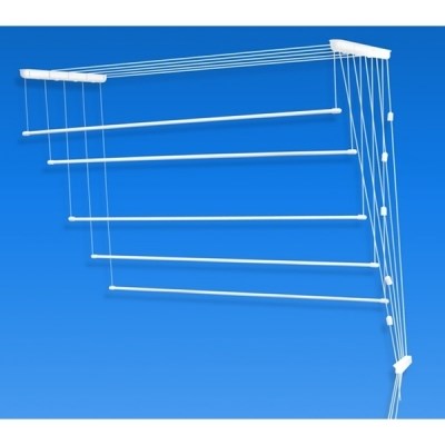 Сушилка крепится к потолку и не занимает много свободного пространства. Стержни, на которые развешивается бельё, опускаются до нужного уровня, чтобы развесить или снять белье.