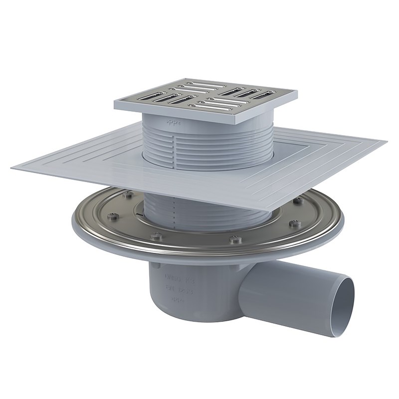 Трап 105 х 105 мм, H=88-174 мм, г/затвор комбин, воротник 2 уров., выпуск 50 мм, нерж.сталь