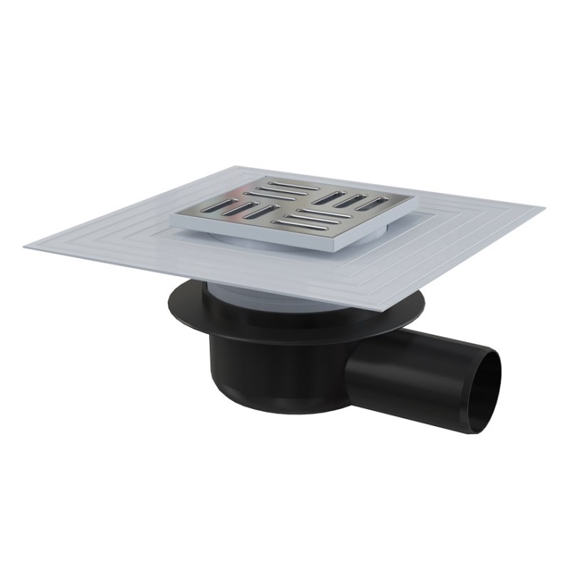 Трап 105 х 105 мм, H=90-113 мм, "сухой" затвор, воротник 2 уров., выпуск 50 мм, нерж.сталь