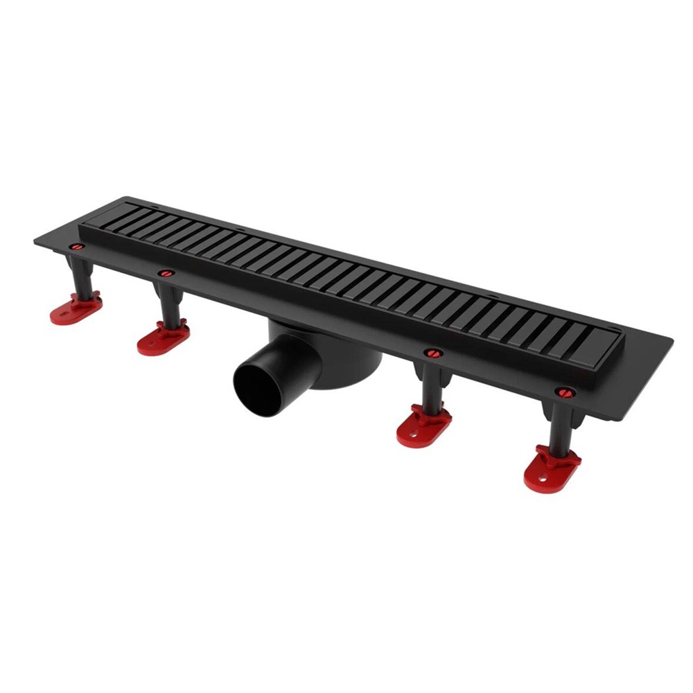 Трап линейный ТП-55D-600 решетка из нерж. стали "Полосы"с гориз. вых.D50 мм рамка из пластика ЧЕРНЫЙ