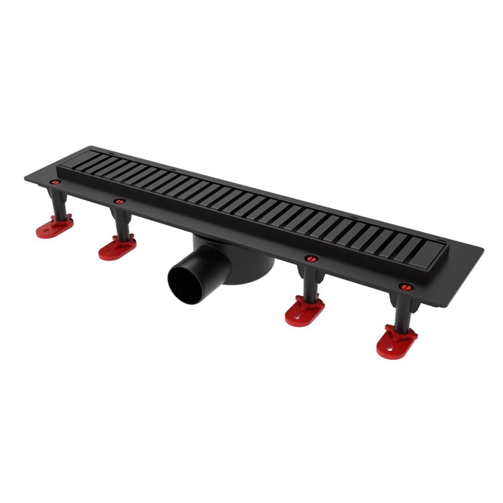 Трап линейный ТП-55D-900 решетка из нерж. стали "Полосы"с гориз. вых.D50 мм рамка из пластика ЧЕРНЫЙ