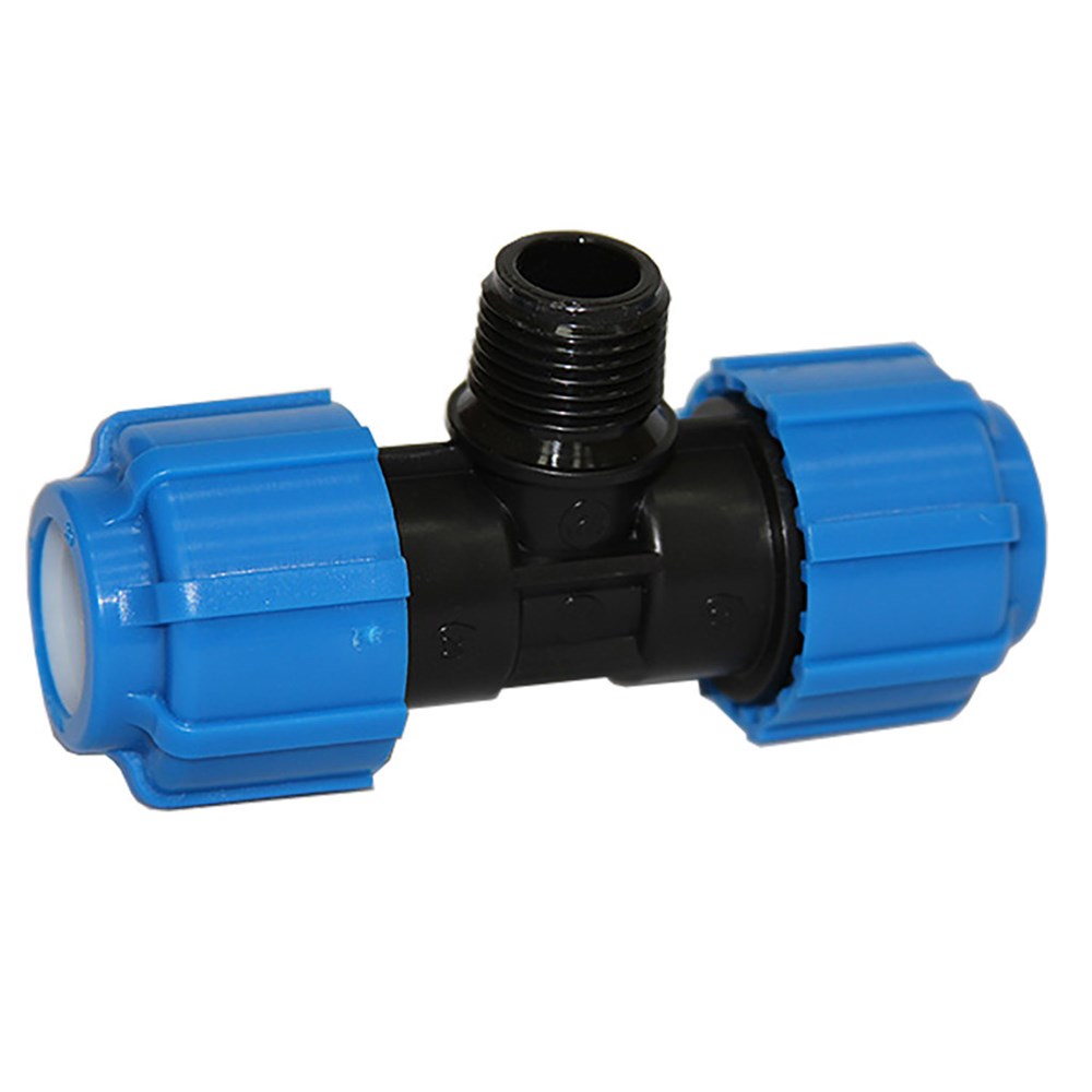 Тройник компрессионный с наружной трубной резьбой является универсальной деталью полиэтиленового трубопровода имеющий наружную резьбу с шагом, соответствующим стандартным размерам стальных труб, благодаря чему этот тройник можно использовать для перехода с ПНД трубы на стальную и наоборот.