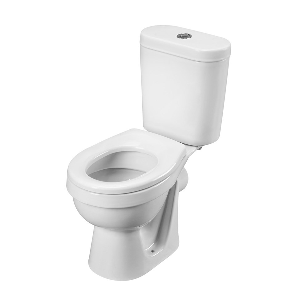 Унитаз оборудован пластиковым сиденьем без крышки.