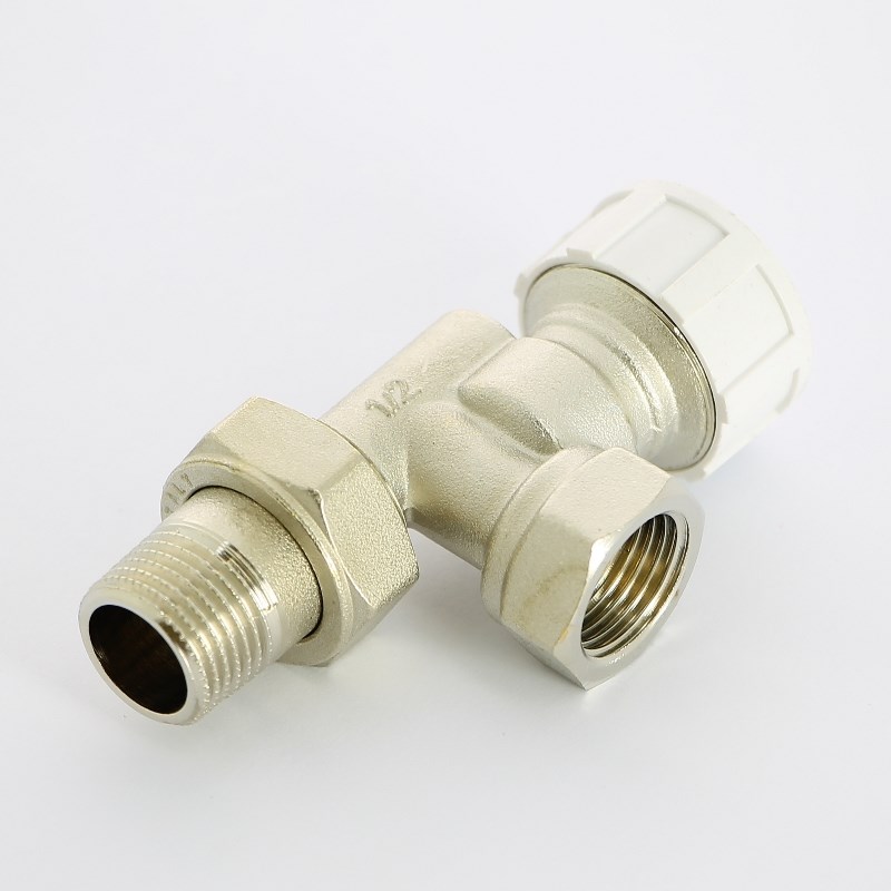 Вентиль термостатический угловой-осевой НВ 1/2" с разъёмным соединением, никелированный